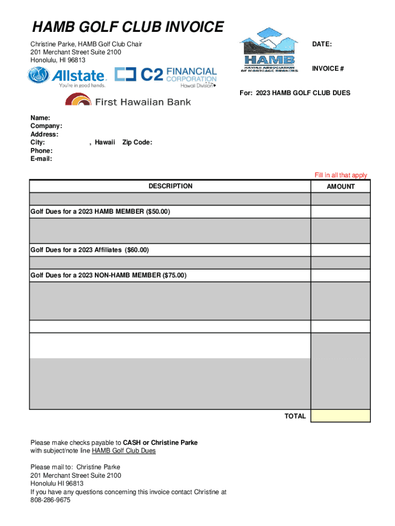 Honolulu, HI 96813DATE:INVOICE #For: 2023 HAM GOLF CLUB Surname: