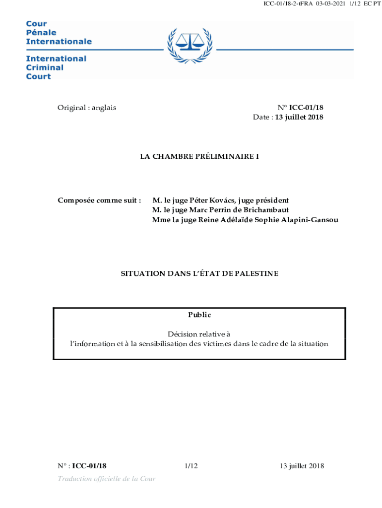 ICC01/182tFRA 03032021 1/12 EC Original : angriest ICC01/18 Date : 13 bullet 2018LA CHAM BRE PRELIMINARY Compose come suit :M. Le June Peter Kovacs, June president M. LE June Marc Person de Brichambaut