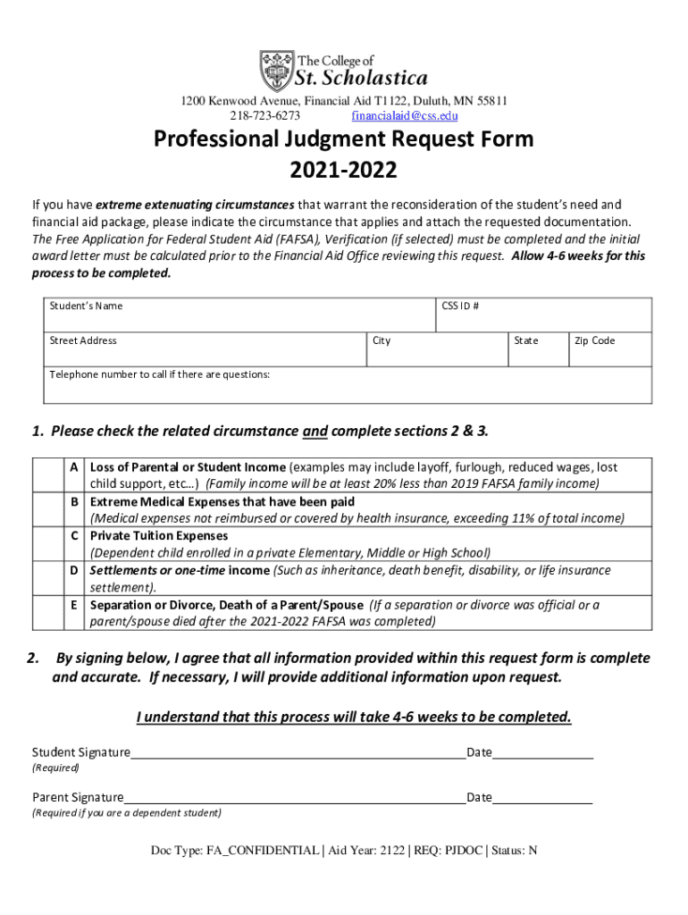 1200 Kenwood Avenue, Financial Aid T1122, Duluth, MN 55811 2187236273 financialaid@css.eduProfessional Judgment Request Form 20212022 If you have extreme extenuating circumstances that warrant the