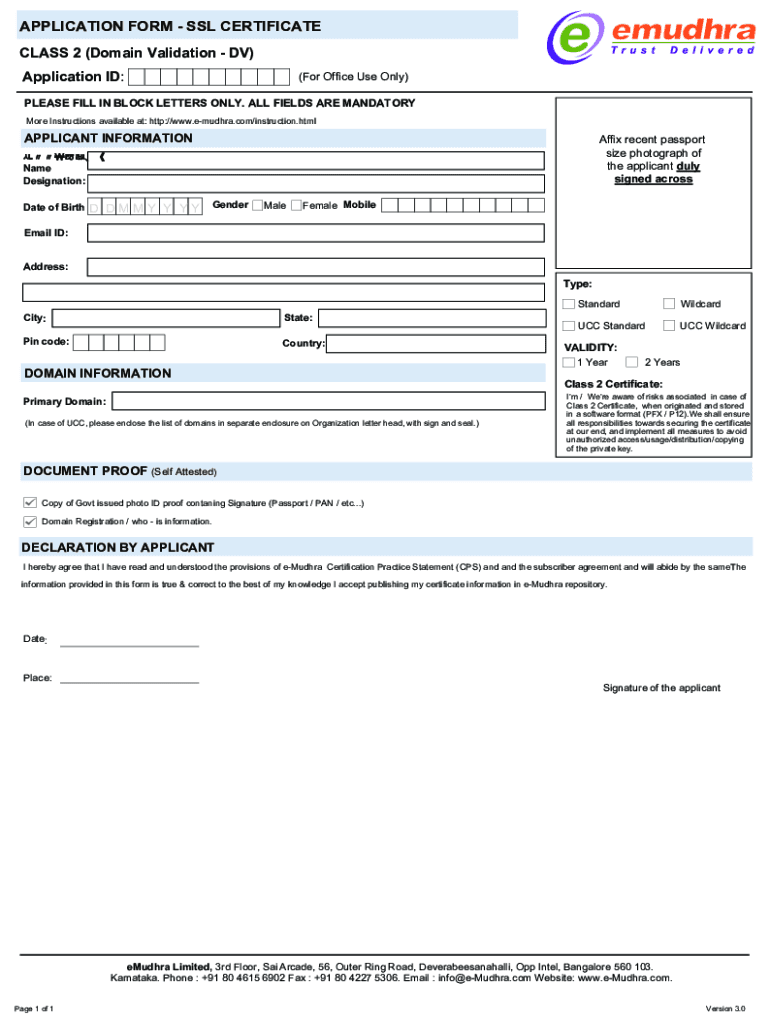 APPLICATION FORM SSL CERTIFICATE CLASS 2 (Domain Validation DV) Application ID:(For Office Use Only)PLEASE FILL IN BLOCK LETTERS ONLY. ALL FIELDS ARE MANDATORY More Instructions available at: http://www.emudhra.com/instruction.htmlAPPLICANT