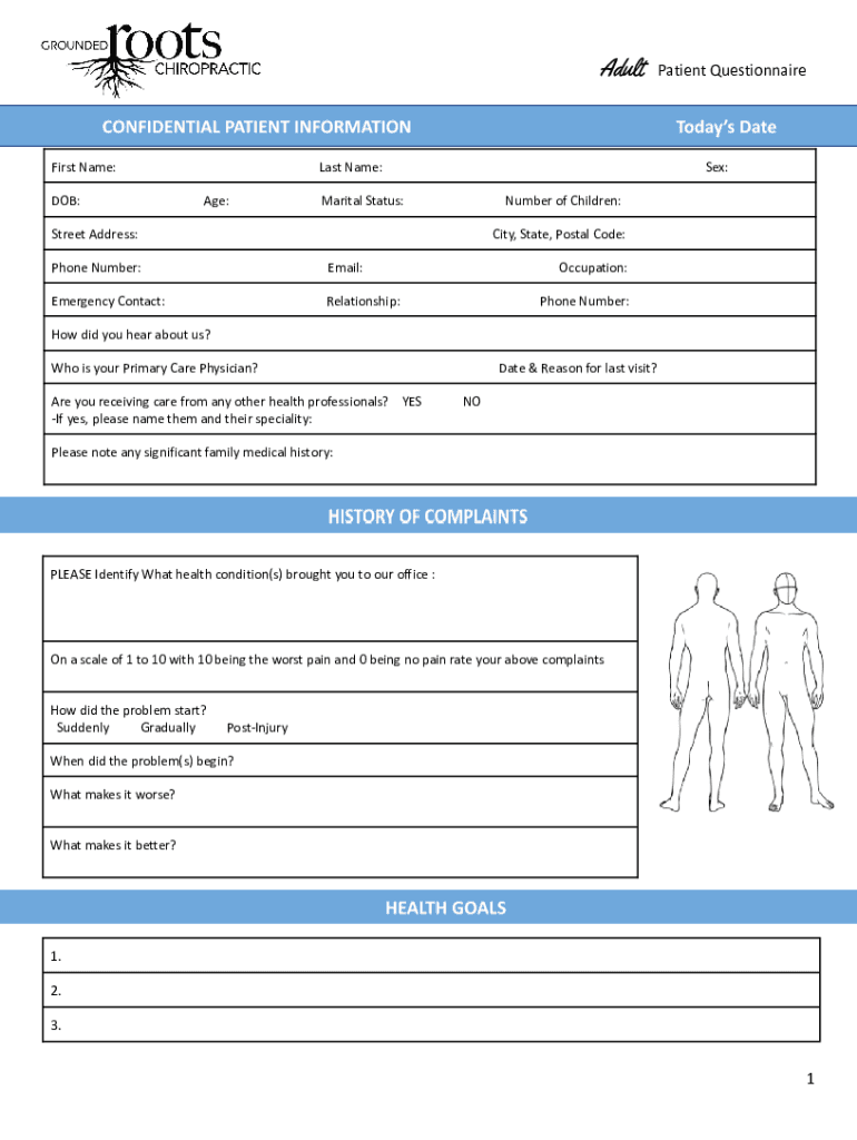 AdultFirst Name: DOB:Last Name: Age:Patient Questionnaires ex:Marital Status:Number of Children:Street Address:City, State, Postal Code:Phone Number:Email:Emergency Contact:Relationship:Occupation: