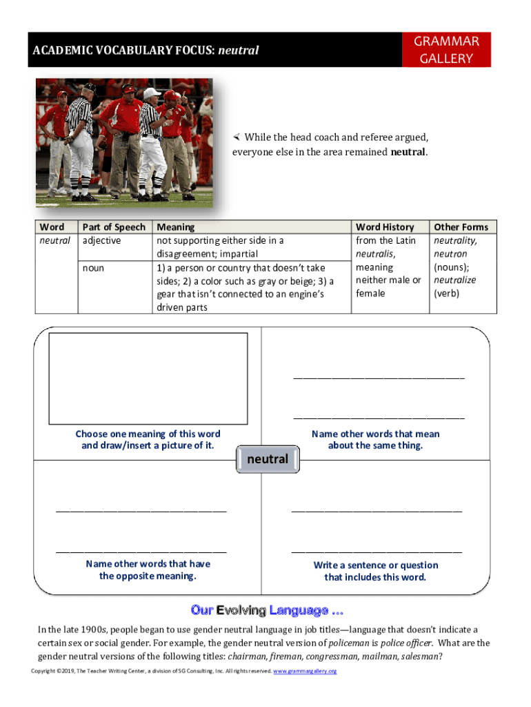 GRAMMAR GALLERYACADEMIC VOCABULARY FOCUS: neutral While the head coach and referee argued, everyone else in the area remained neutral. Word neutralist of Speech adjective unmeaning not supporting