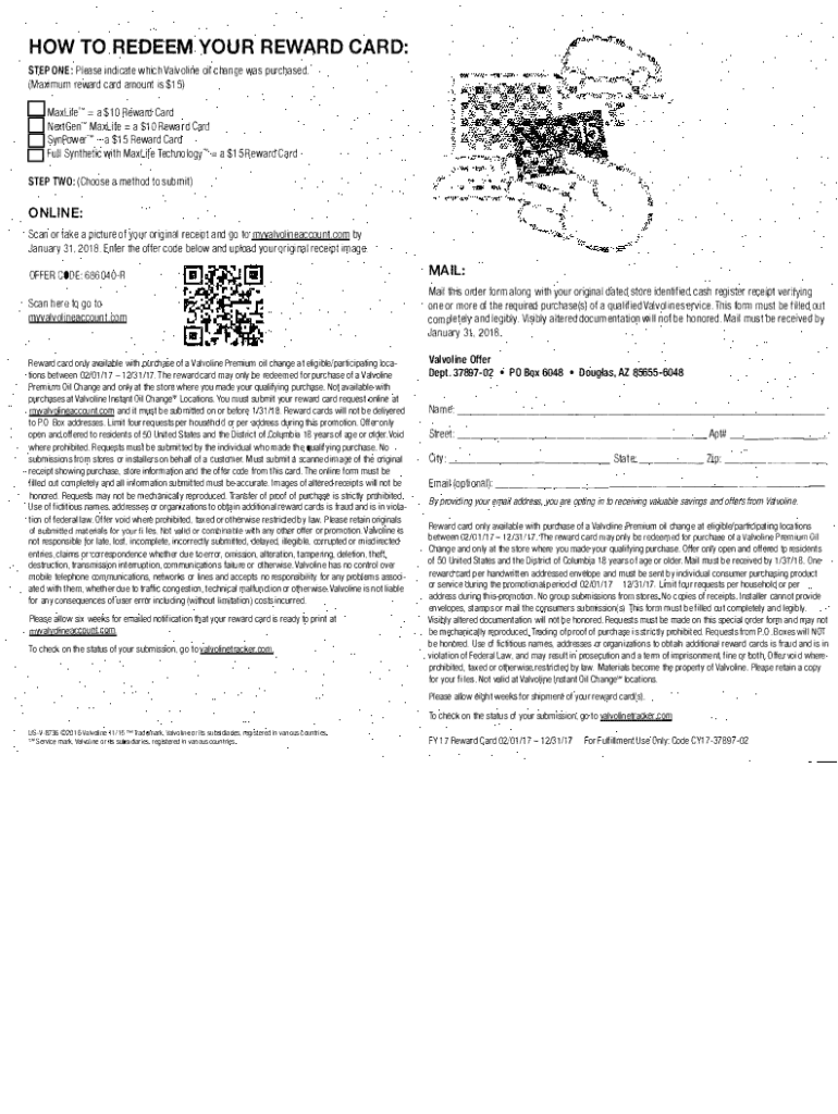 COMPLETE NEXT PAGEBOY TO REDEEM YOUR REWARD CARD:STEP ONE: Please indicate which Valvoline oil change was purchased.(Maximum reward card amount is $15)_ Max life\'M a $10 Reward Card _ Next Gen\”