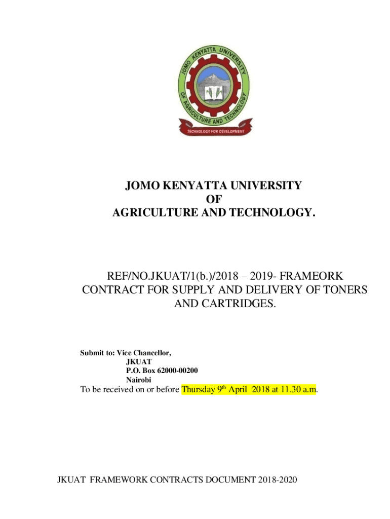 COMO KENYATTA UNIVERSITY OF AGRICULTURE AND TECHNOLOGY.REF/NO.JKUAT/1(b.)/2018 2019 FRAMEWORK CONTRACT FOR SUPPLY AND DELIVERY OF TONERS AND CARTRIDGES. Submit to: Vice Chancellor, JK UAT P.O. Box