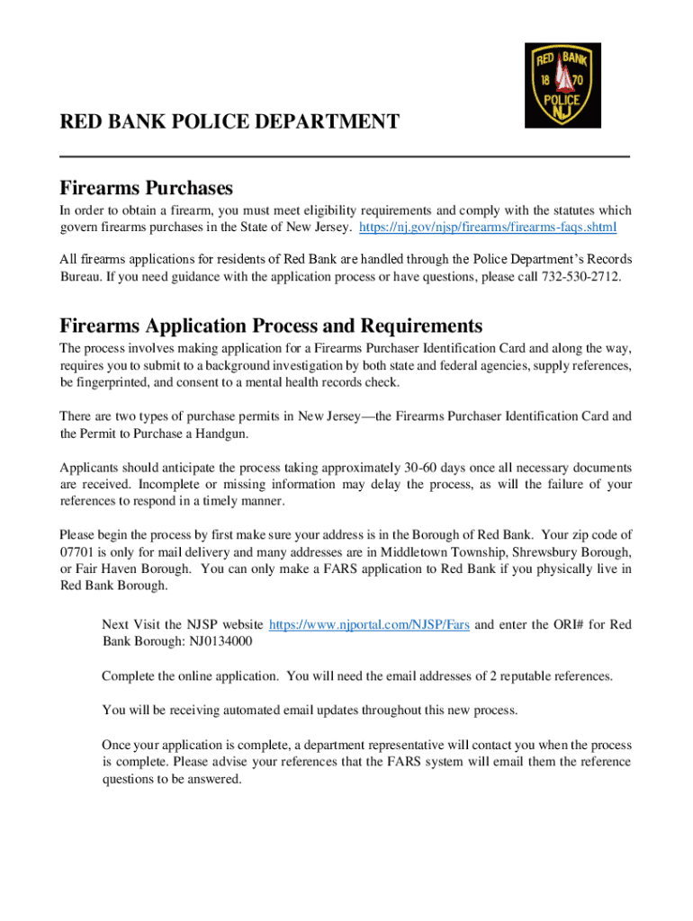Get the free RED BANK POLICE DEPARTMENT Firearms Purchases Firearms ...