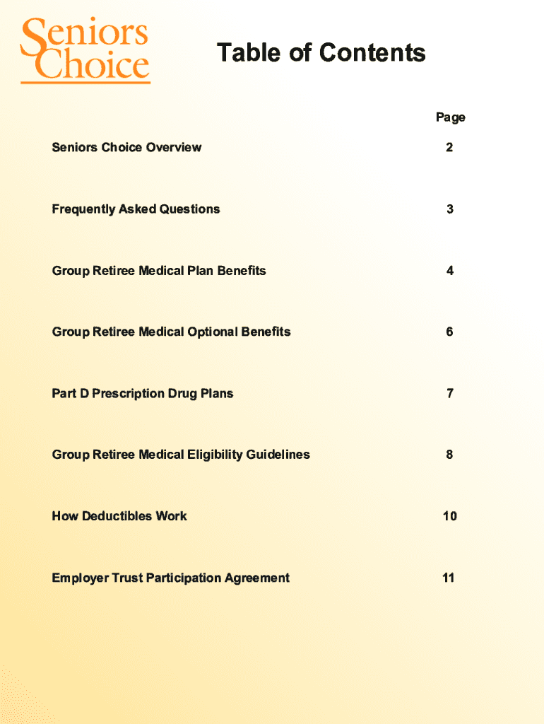 Table of Contents Page Seniors Choice Overview2Frequently Asked Questions3Group Retiree Medical Plan Benefits4Group Retiree Medical Optional Benefits6Part D Prescription Drug Plans7Group Retiree Medical