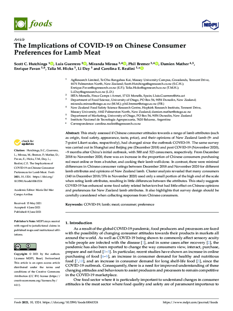 Foods Article Implications of COVID-19 on Chinese Consumer Preferences for Lamb Meat Scott C. Hutchins 1, Luis Guerrero 2, Miranda Mimosa 3,4, Phil Bremen 3,4, Damien Mather 4,5, Enrique Pavan 1,6,