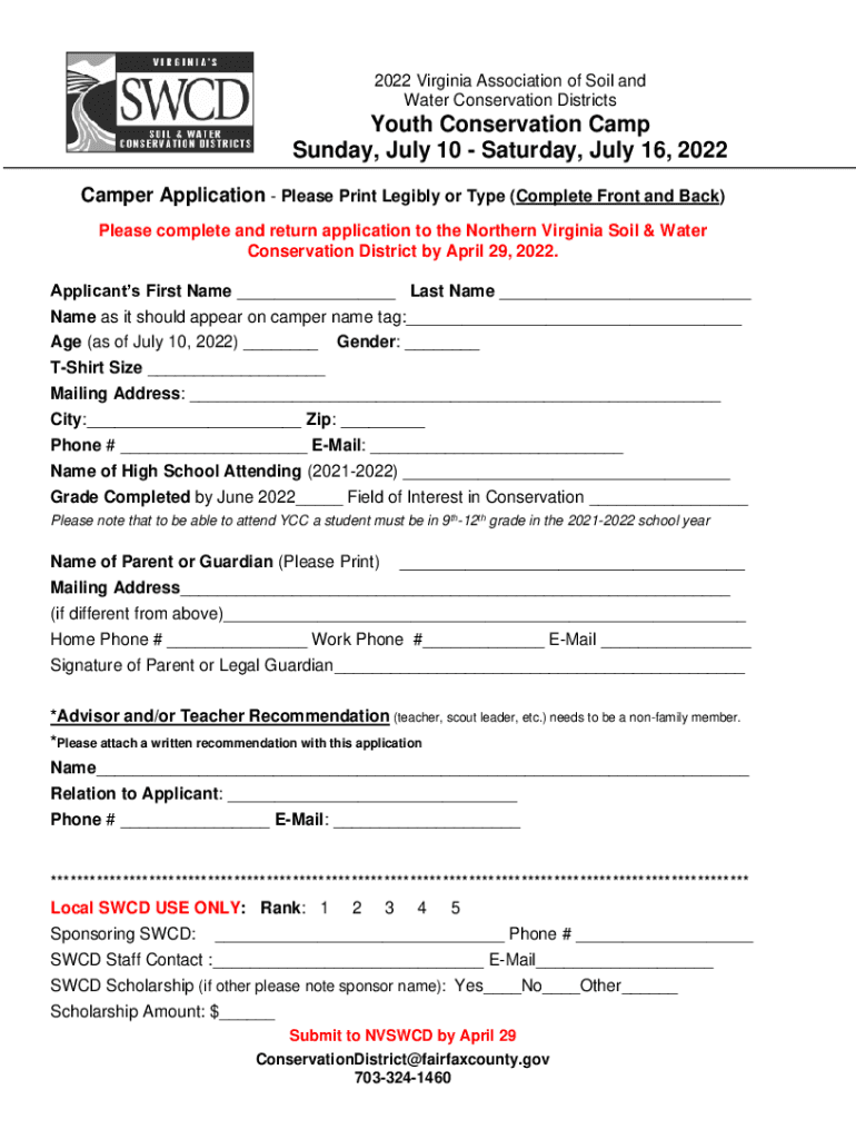 2022 Virginia Association of Soil and Water Conservation DistrictsYouth Conservation Camp Sunday, July 10 Saturday, July 16, 2022, Camper Application Please Print Legibly or Type (Complete Front and