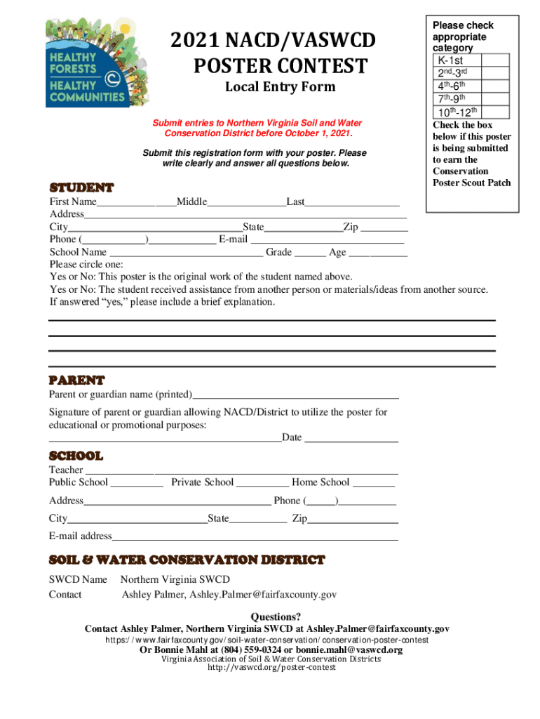 2021 NAD/VASCO POSTER CONTEST Local Entry Form Submit entries to Northern Virginia Soil and Water Conservation District before October 1, 2021. Submit this registration form with your poster. Please