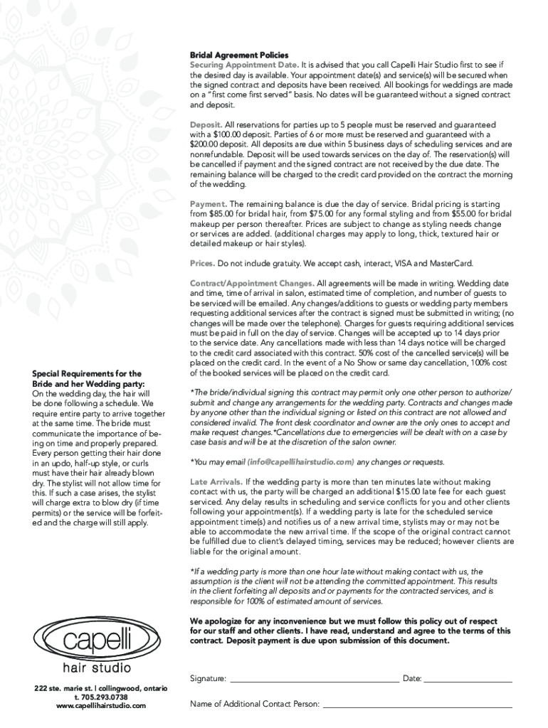 Get the free Bridal Agreement Policies Securing Appointment Date. It is advised ...