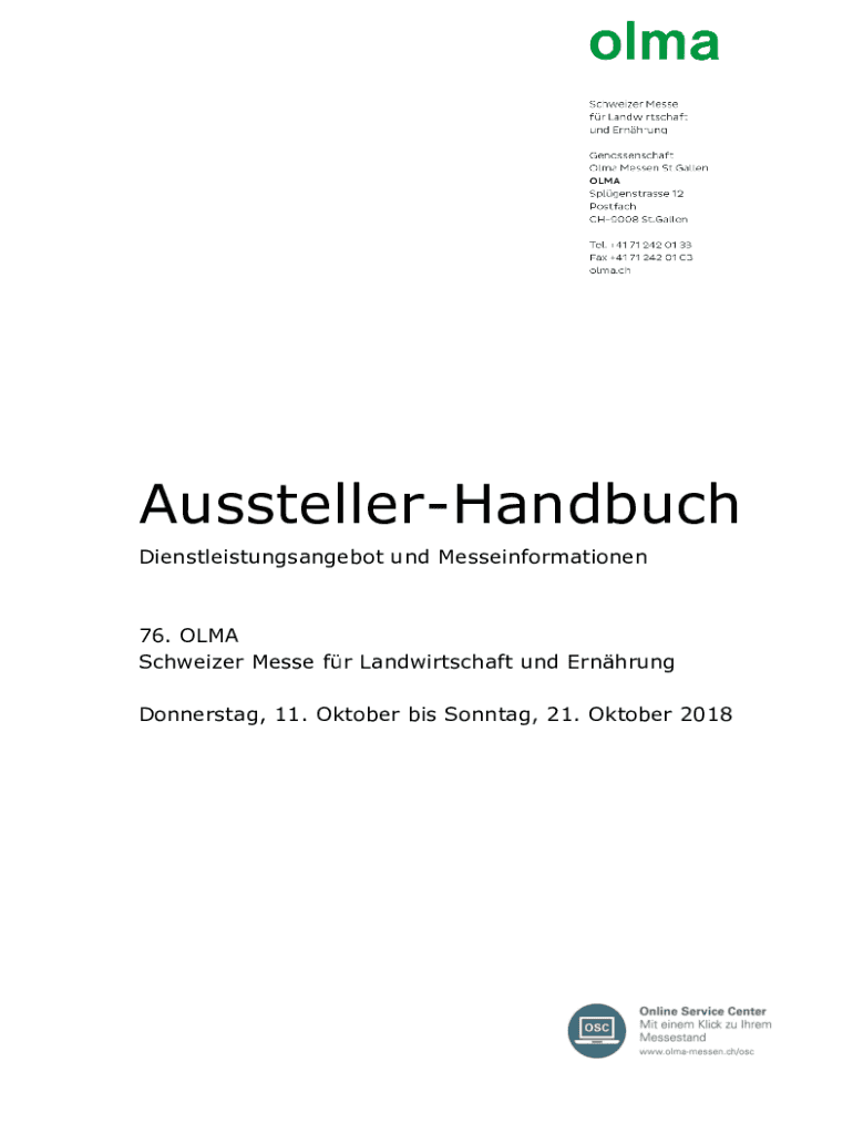 AusstellerHandbuch Dienstleistungsangebot UND Messeinformationen76. ALMA Schweitzer Jesse for Landwirtschaft UND Erring Donner stag, 11. October bis Sontag, 21. October 2018Inhaltsverzeichnis Dienstleistungsangebot