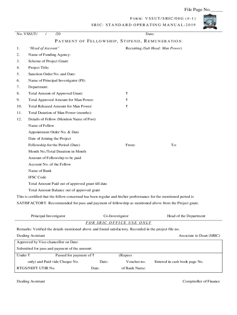 File Page No.___ FORM: VSS UT/ERIC/06G (P1) ERIC: STANDARD OPERATING MANUAL2019 No. VSS UT///20PAYMENTDate:FELLOWSHIP, STIPEND, REMUNERATIONOF1. Head of Account2. Name of Funding Agency:3. Scheme