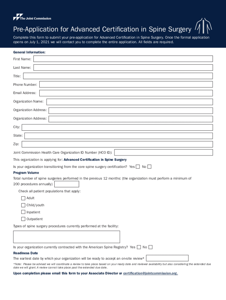 Reapplication for Advanced Certification in Spine Surgery Complete this form to submit your reapplication for Advanced Certification in Spine Surgery. Once the formal application opens on July 1,