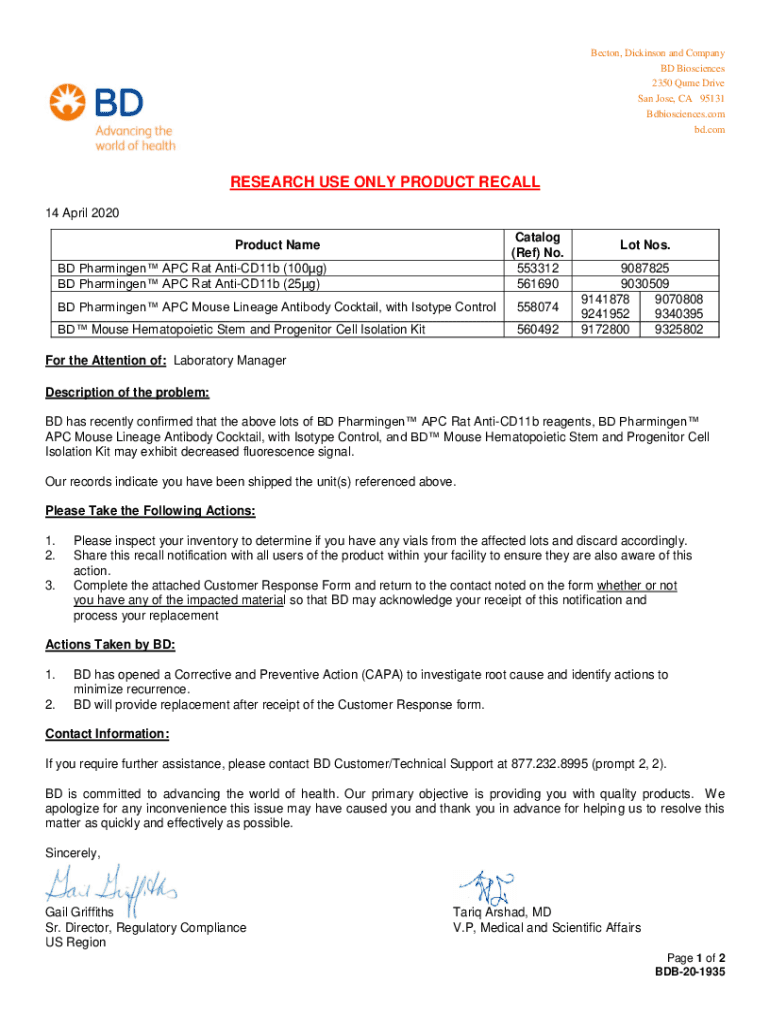 Benton, Dickinson and Company BD Biosciences 2350 Hume Drive San Jose, CA 95131 Bdbiosciences.com BD.research USE ONLY PRODUCT RECALL 14 April 2020 Catalog (Ref) No. 553312 561690Product Name BD Harlingen