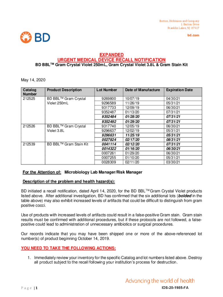 Benton, Dickinson and Company 1 Benton Drive Franklin Lakes, NJ 07417 BD.expanded URGENT MEDICAL DEVICE RECALL NOTIFICATION BD BBL TM Gram Crystal Violet 250mL, Gram Crystal Violet 3.8L & Gram Stain
