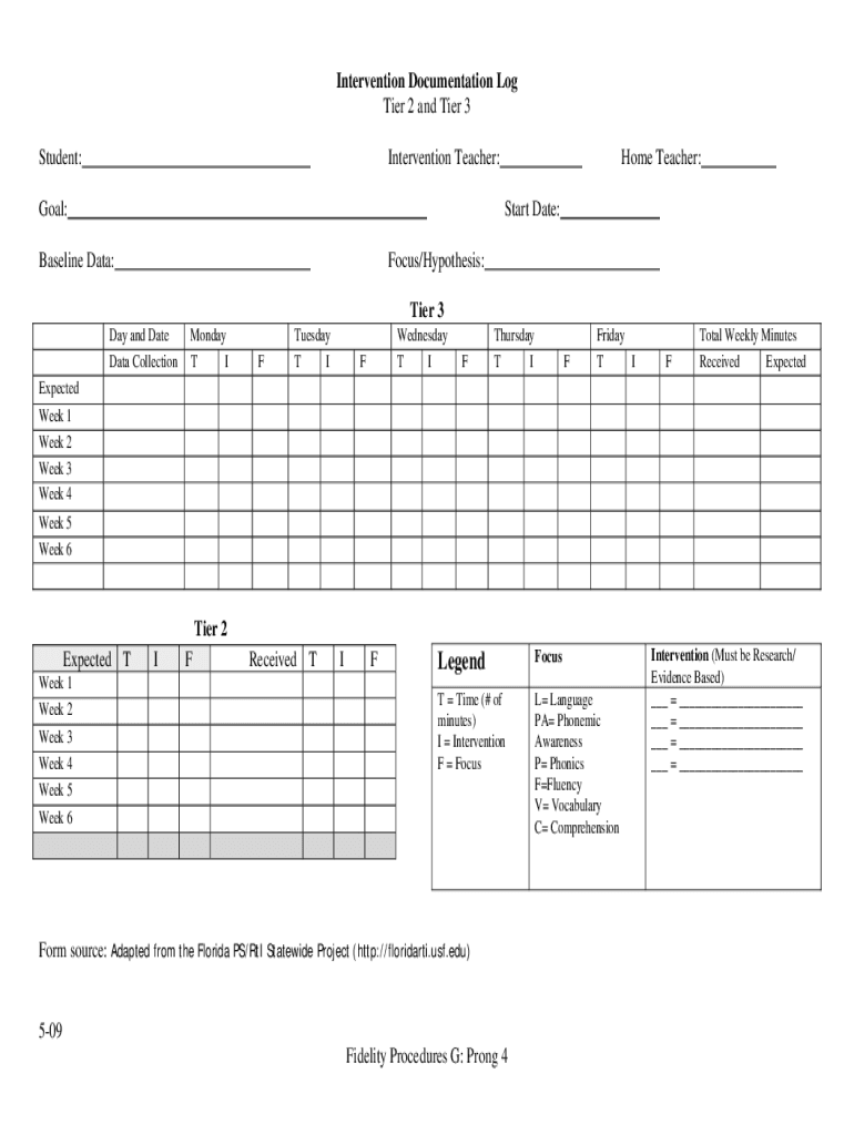Intervention Documentation Log Tier 2 and Tier 3 Student:Intervention Teacher:Home Teacher: Start Date:Goal: Focus/Hypothesis:Baseline Data:Tier 3 Day and Date Data Collection Monday T IF Tuesday