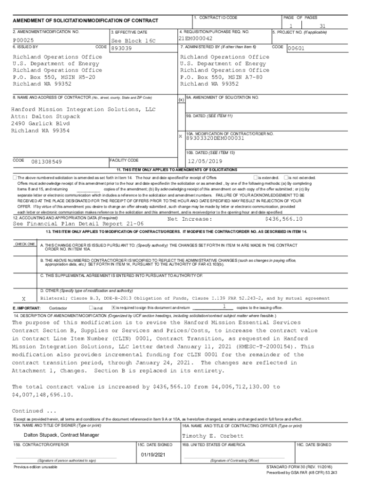 1. CONTRACT ID CODEPENDENT OF SOLICITATION/MODIFICATION OF CONTRACT 2. AMENDMENT/MODIFICATION NO.3. EFFECTIVE DATEP00025 6. ISSUED Bodensee Block 16C 893039Richland Operations Office U.S. Department