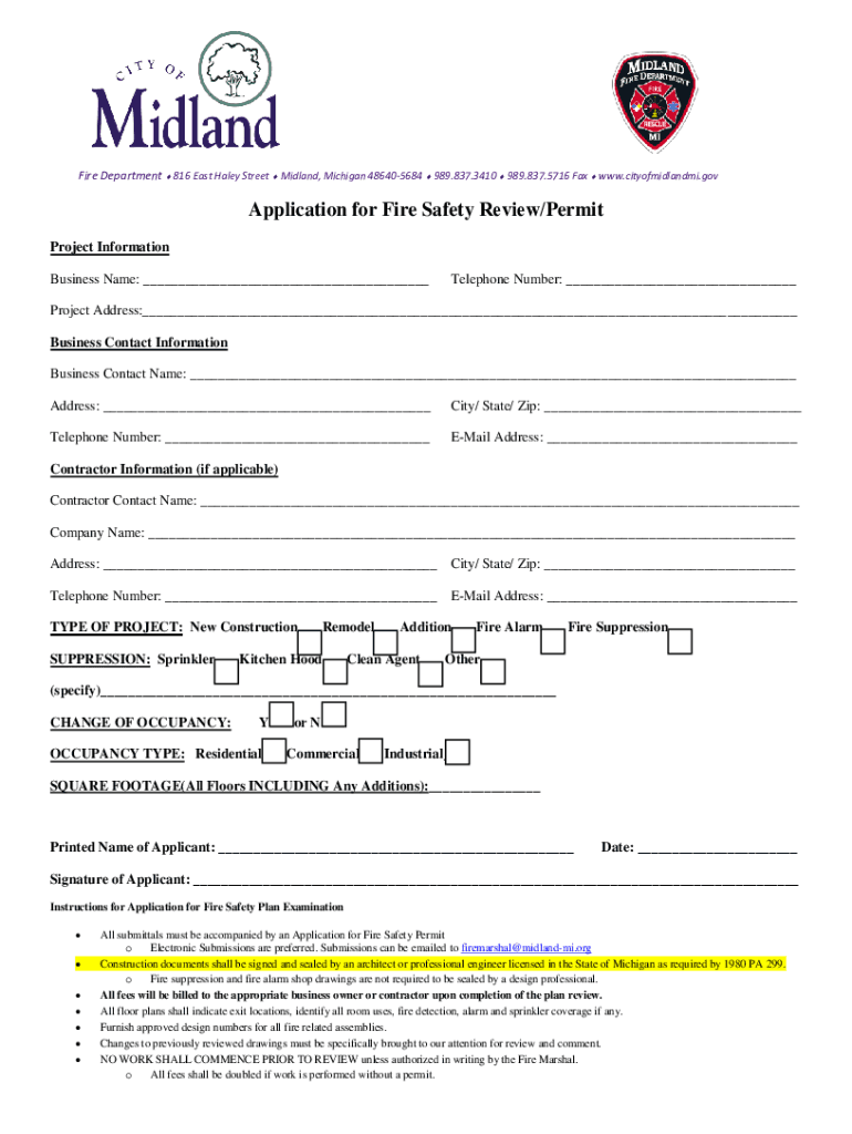 Fire Department 816 East Haley Street Midland, Michigan 486405684 989.837.3410 989.837.5716 Fax www.cityofmidlandmi.govApplication for Fire Safety Review/Permit Project Information Business Name: