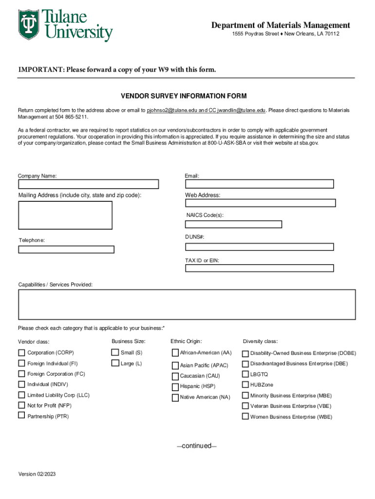 Department of Materials Management 1555 Hydras Street New Orleans, LA 70112IMPORTANT: Please forward a copy of your W9 with this form. VENDOR SURVEY INFORMATION FORM Return completed form to the address