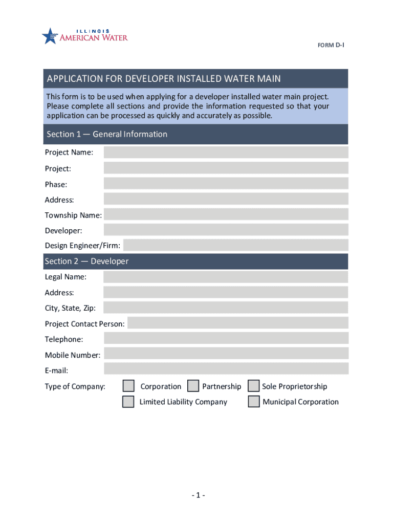 FORM APPLICATION FOR DEVELOPER INSTALLED WATER MAIN This form is to be used when applying for a developer installed water main project. Please complete all sections and provide the information requested