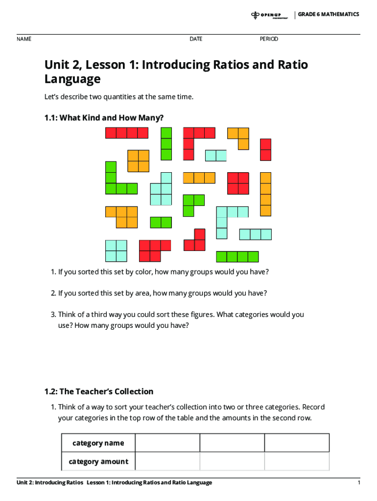 GRADE 6 MATHEMATICSNAMEDATEPERIODUnit 2, Lesson 1: Introducing Ratios and Ratio Language Lets describe two quantities at the same time.1.1: What Kind and How Many?1. If you sorted this set by color,