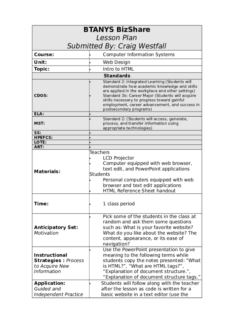 What is BTANYS BizShare Lesson Plan Submitted By: Craig Westfall Form?