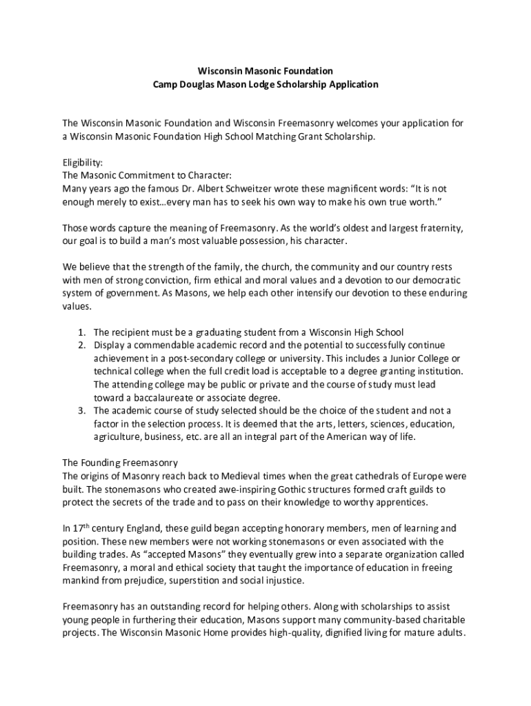 Wisconsin Masonic Foundation Camp Douglas Mason Lodge Scholarship Application Wisconsin Masonic Foundation and Wisconsin Freemasonry welcomes your application for a Wisconsin Masonic Foundation High