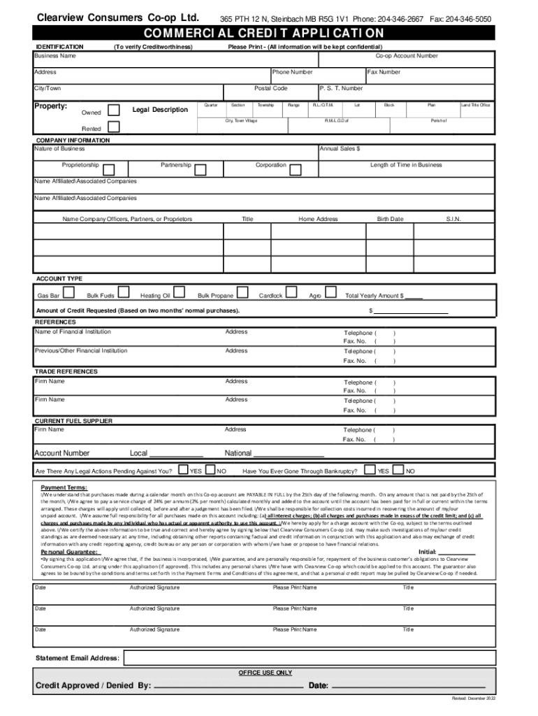 Clearview Consumers Coop Ltd.365 PTH 12 N, Staubach MB R5G 1V1 Phone: 2043462667 Fax: 2043465050COMMERCIAL CREDIT APPLICATION