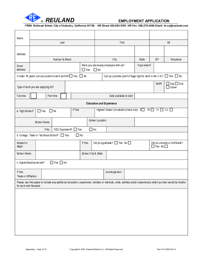 REULANDEMPLOYMENT APPLICATION COVER LETTER17969 Railroad Street, City of Industry, California 91748 HR Direct 626.854.5193 HR Fax: 626.270.4469 Email: hrca@reuland.com Main: 626.964.6411 www.reuland.comPLEASE
