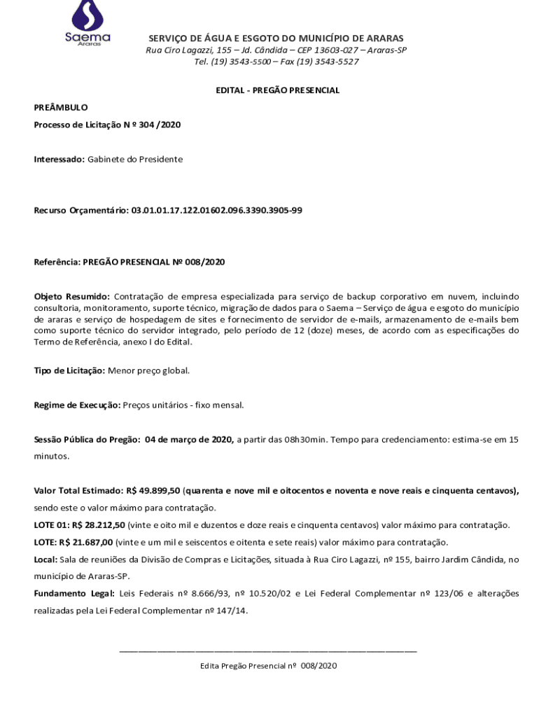 SERGIO DE GUA E SOTO DO MUNICIPAL DE ARARAT RUA Cairo Palazzi, 155 JD. Candida CEP 13603027 Arrays Tel. (19) 35435500 Fax (19) 35435527 EDIT AL PRESO PRESENCE PREMIUM Process ode Licit N 304 /2020Interessado: