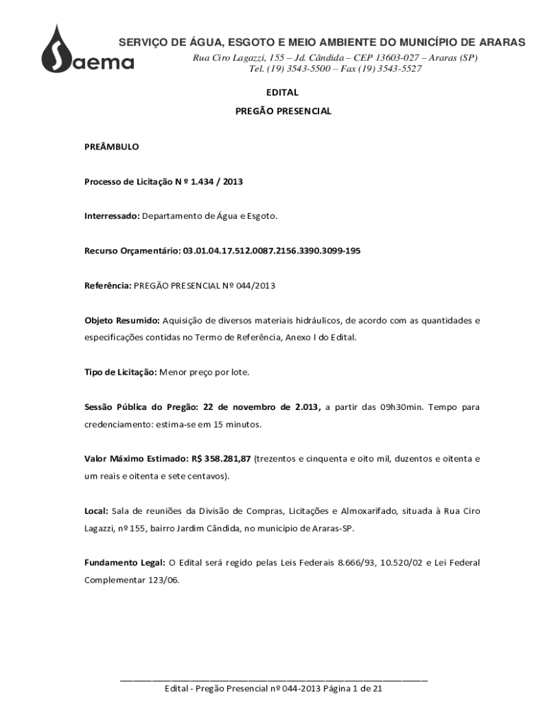 Obtenha o gratuito Objeto Resumido: Aquisio de diversos materiais hidrulicos, de acordo com as qu...
