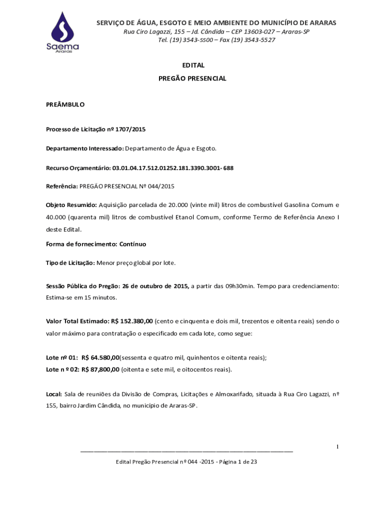 Obtenha o gratuito Objeto Resumido: Aquisio parcelada de 20