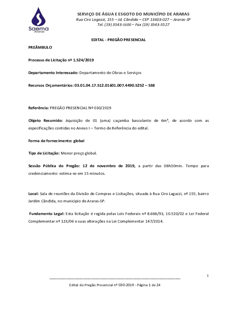 Obtenha o gratuito Objeto Resumido: Aquisio de 01 (uma) caamba basculante de 6m, de acordo com as