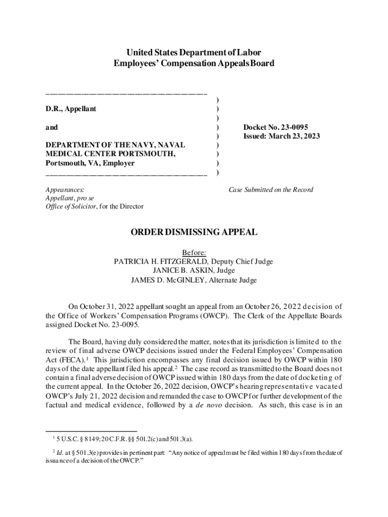 United States Department of Labor Employees Compensation Appeals Board ___ D.R., Appellant and DEPARTMENT OF THE NAVY, NAVAL MEDICAL CENTER PORTSMOUTH, Portsmouth, VA, Employer ___ Appearances: Appellant,