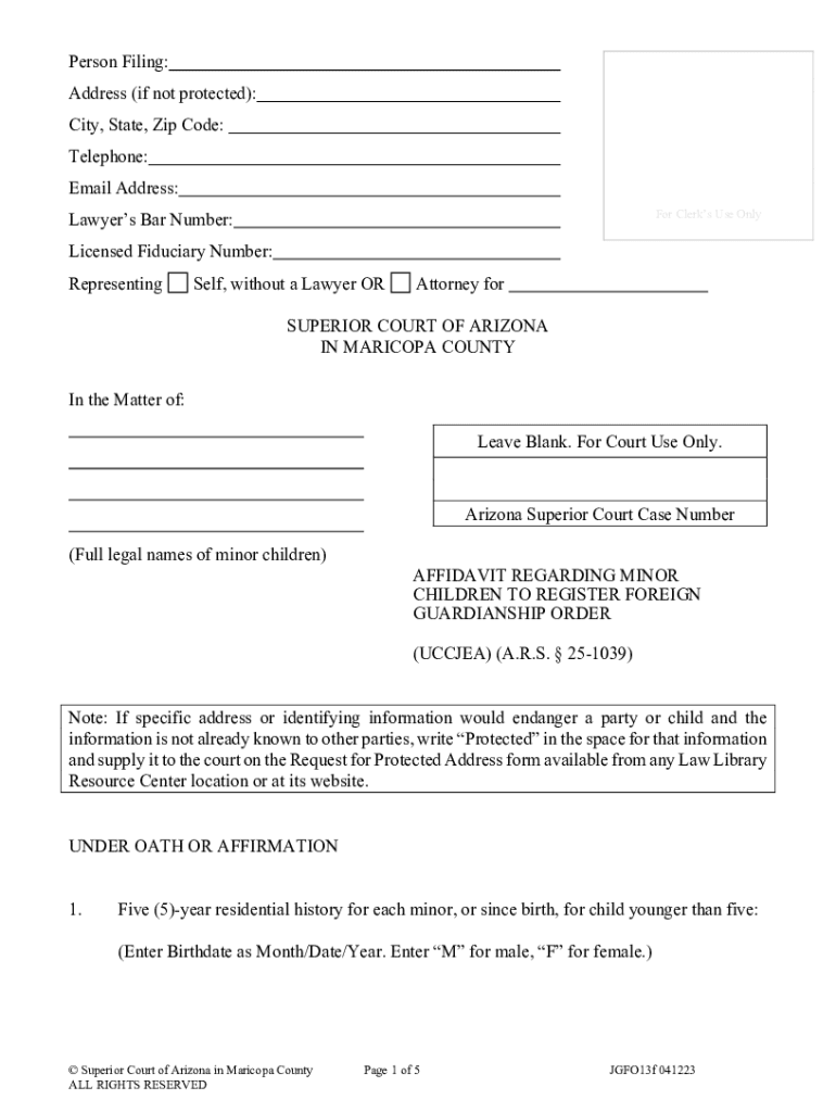 Get the free AFFIDAVIT REGARDING MINOR CHILDREN TO REGISTER FOREIGN GUARDIANSHIP ORDER JGFO13f. A...