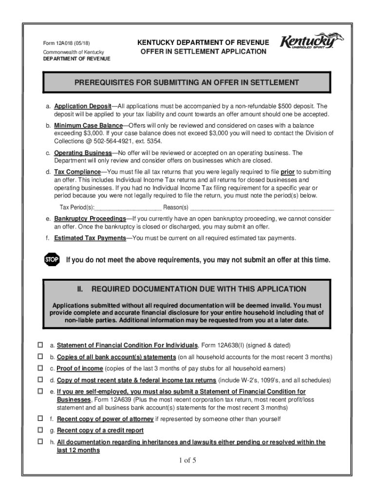 Form 12A018 (05/18) Commonwealth of Kentucky DEPARTMENT OF REVENUEKENTUCKY DEPARTMENT OF REVENUE OFFER IN SETTLEMENT APPLICATIONPREREQUISITES FOR SUBMITTING AN OFFER IN SETTLEMENT a. Application Deposits