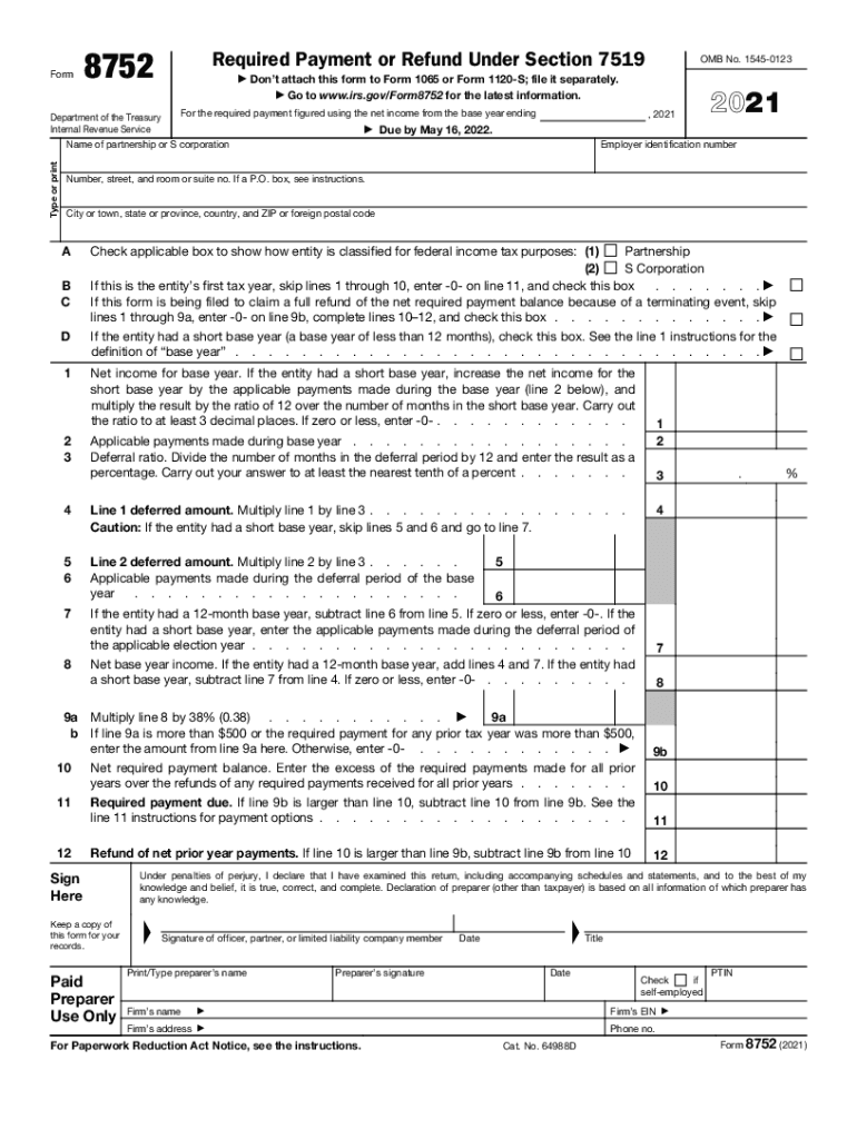Form8752Department of the Treasury Internal Revenue ServiceRequired Payment or Refund Under Section 7519 Don't attach this form to Form 1065 or Form 1120S; file it separately. Go to www.irs.gov/Form8752