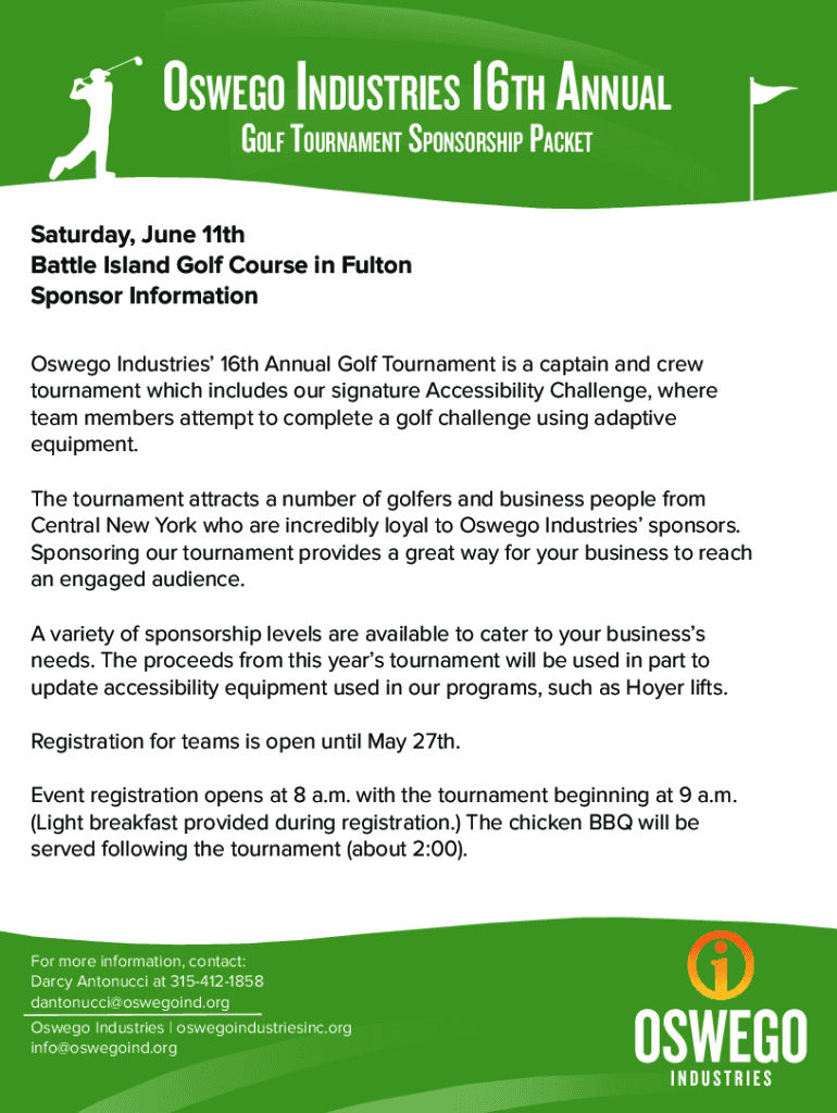 Oswego Industries 16th Annually Tournament Sponsorship Packet Saturday, June 11th Battle Island Golf Course in Fulton Sponsor InformationOswego Industries 16th Annual Golf Tournament is a captain