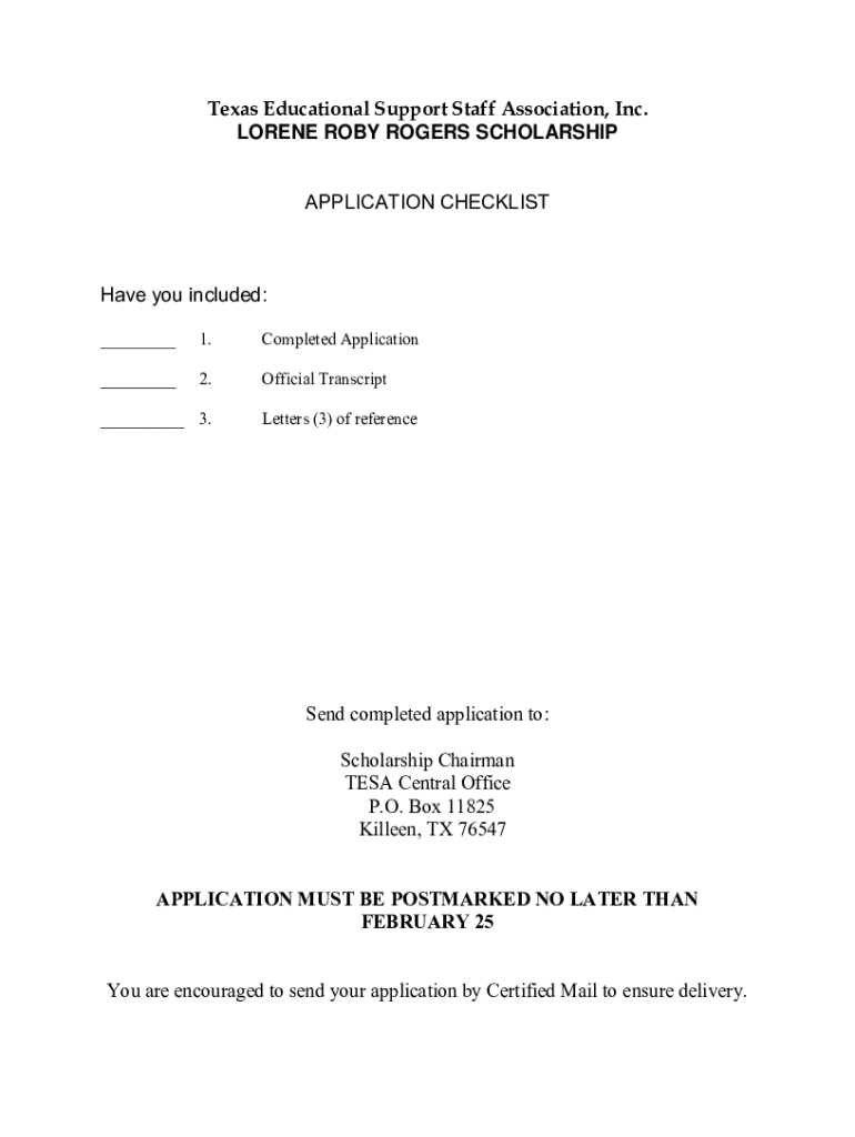 Texas Educational Support Staff Association, Inc. Lorene Rob Rogers Scholarship Application Deadline: February 25 Return to: Scholarship Chairman TEST Central Office P.O. Box 11825 Killeen, TX 76547Texas