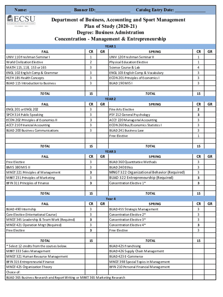 Name: ___ Banner ID:___Catalog Entry Date: ___Department of Business, Accounting and Sport Management Plan of Study (202021) Degree: Business Administration Concentration Management & Entrepreneurship