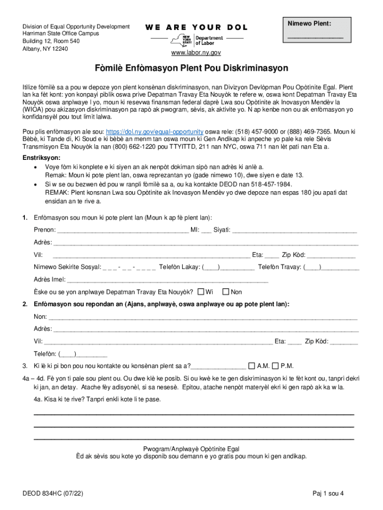 Division of Equal Opportunity Development Harriman State Office Campus Building 12, Room 540 Albany, NY 12240Nimewo Plant: ___ www.labor.ny.govFmil Enfmasyon Plant POU Discrimination Utilize fail