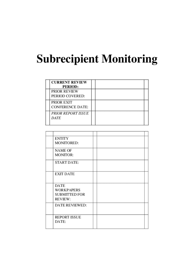 Subrecipient Monitoring CURRENT REVIEW PERIOD: PRIOR REVIEW PERIOD COVERED: PRIOR EXIT CONFERENCE DATE: PRIOR REPORT ISSUE MATERNITY MONITORED: NAME OF MONITOR: START DATE: EXIT DATE WORKERS SUBMITTED