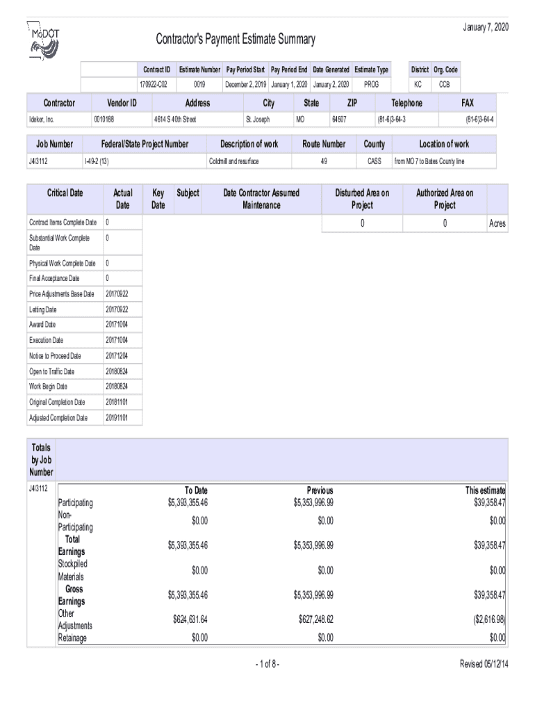 January 7, 2020Contractor\'s Payment Estimate Summary contract and estimate 170922_C02_0019ContractorVendor Indexer, Inc.0010188Job Number J4I3112Contract Estimate Number Period Started Period Endgame