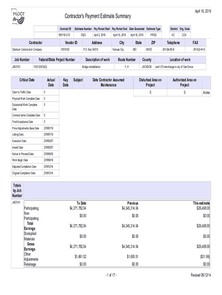 April 19, 2019Contractor\'s Payment Estimate Summary contract and estimate 180119_C10_0023ContractorJ4S3151Estimate Number 0023Date GeneratedEstimate Type April 15, 2019April 16, 2019PROGKCZIPTelephoneCityP.