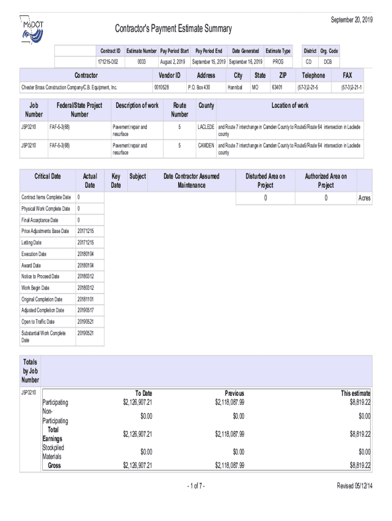 September 20, 2019Contractor\'s Payment Estimate Summary contract and estimate 171215_D02_0033Contract ID 171215D02Estimate Number 0033August 2, 2019ContractorVendor ID Chester Cross Construction