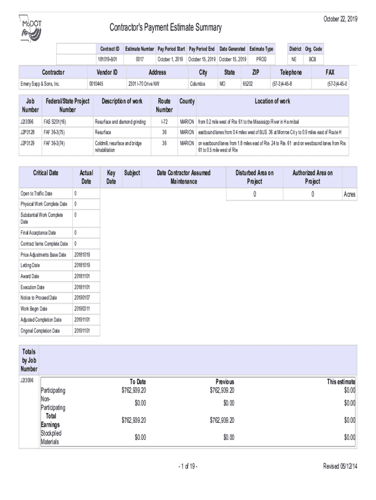 October 22, 2019Contractor\'s Payment Estimate Summary