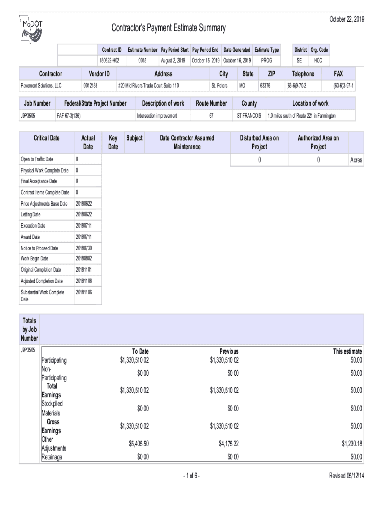 October 22, 2019Contractor\'s Payment Estimate Summary contract and estimate 180622_H02_0015ContractorJ9P3505Estimate Number 0015Vendor Pavement Solutions, LLC Job NumberContract ID 180622H020012183Pay