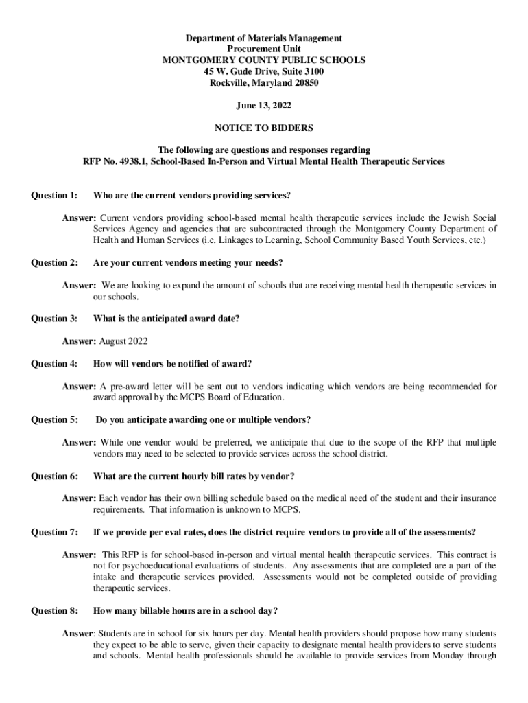 Department of Materials Management Procurement Unit MONTGOMERY COUNTY PUBLIC SCHOOLS 45 W. Guide Drive, Suite 3100 Rockville, Maryland 20850 June 13, 2022, NOTICE TO BIDDERS The following are questions