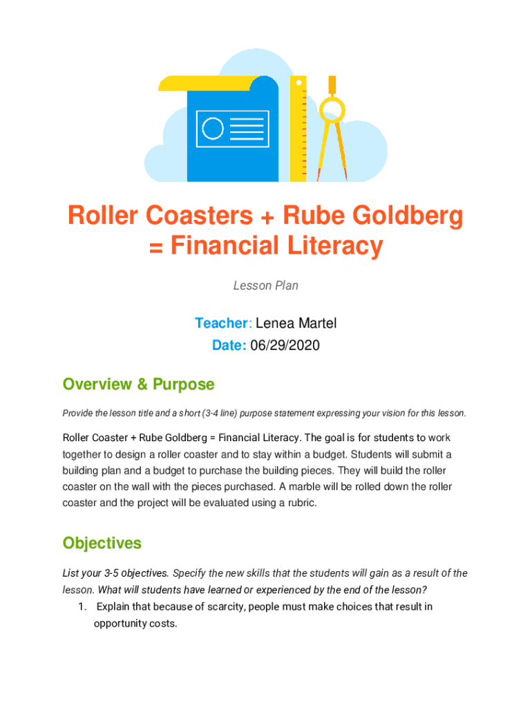 Roller Coasters + Rube Goldberg Financial Literacy Lesson Headteacher: Lena Martel Date: 06/29/2020Overview & Purpose Provide the lesson title and a short (34 line) purpose statement expressing your