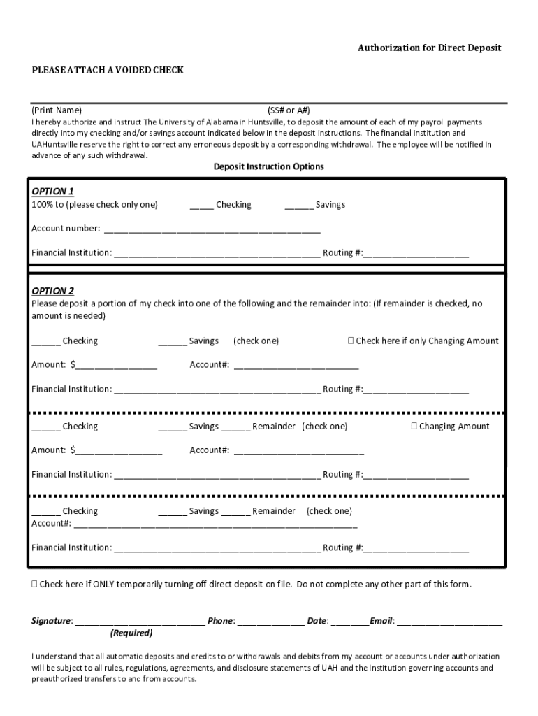Authorization for Direct Deposit PLEASE ATTACH A VOIDED CHECK(Print Name)(SS# or A#)I hereby authorize and instruct The University of Alabama in Huntsville, to deposit the amount of each of my payroll